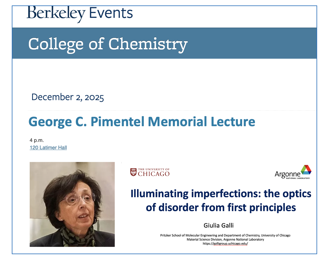 Giulia Galli, who was elected to become a member of the National Academy of Science (NAS) in 2020, delivered a talk at the annual meeting of NAS representing Class III's section on Applied Physical Sciences. A recording of her talk can be found here.