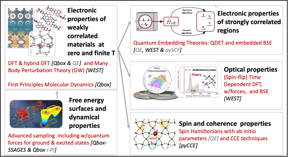 The materials’ properties (in black) of interest to the Center, together with methods used and developed (in red) in the Center and codes (within square brackets). Codes developed within MICCoM are in black while codes used by the MICCoM team and developed elsewhere are in gray: Qbox, WEST, SSAGES and PySSAGES, and pyCCE; QE (Quantum Espresso) ; pySCF; i-PI.