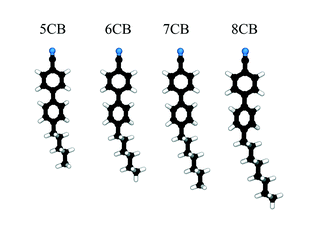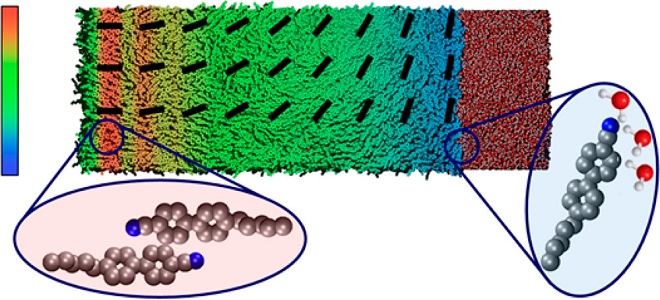 The ordered environment presented by liquid crystals at interfaces enables a range of novel functionalities that is only now beginning to be exploited in applications ranging from light focusing devices to biosensors. One key feature of liquid crystals is that molecular events occurring at an interface propagate over large distances through the bulk. In spite of their importance, our fundamental understanding of liquid crystal–water and liquid crystal–air interfaces remains limited. In this work, we present results from large-scale atomistic molecular dynamics simulations on the organization of the nematic and isotropic phases of the nitrile-containing mesogenic molecule 4-cyano-4′-pentylbiphenyl (5CB) in the vicinity of vacuum and aqueous interfaces. Hybrid boundary conditions are imposed by confining 5CB films between vacuum and an aqueous medium to examine how those two types of interfaces influence the specific structural arrangement and ordering of 5CB. Consistent with experiments, our results indicate that 5CB exhibits homeotropic anchoring at the vacuum interface, and planar alignment at aqueous interfaces. Two-dimensional molecular dynamics potential of mean force calculations and average polarization densities show that the polar nitrile group of 5CB remains hydrated near the aqueous interface, where it modulates the orientation of water molecules. Estimates of the anchoring strength reveal an oscillatory decay and a semilinear decay with distance from the interface in vacuum and water, respectively.