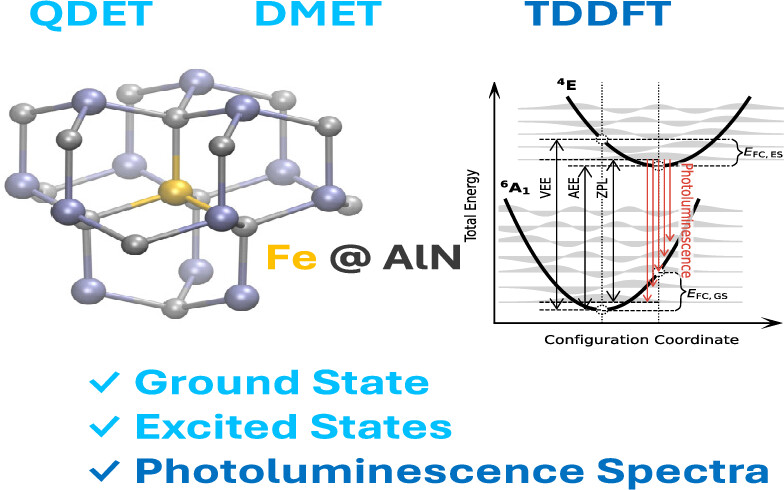 We investigate the electronic properties of an exemplar transition metal impurity in an insulator, with the goal of accurately describing strongly correlated defect states. We consider iron in aluminum nitride, a material of interest for hybrid quantum technologies, and we carry out calculations with quantum embedding methods, density matrix embedding theory (DMET) and quantum defect embedding theory (QDET), and with spin-flip time-dependent density functional theory (TDDFT). We show that both DMET and QDET accurately describe the ground state and low-lying excited states of the defect and that TDDFT yields photoluminescence spectra in agreement with experiments. In addition, we provide a detailed discussion of the convergence of our results as a function of the active space used in the embedding methods, thus defining a protocol to obtain converged data directly comparable with experiments.
