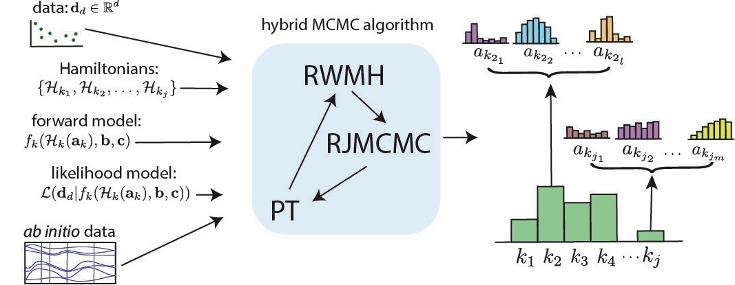 High-throughput characterization often requires estimating parameters and model dimension from experimental data of limited quantity and quality. Such data may result in an ill-posed inverse problem, where multiple sets of parameters and model dimensions are consistent with available data. This ill-posed regime may render traditional machine learning and deterministic methods unreliable or intractable, particularly in high-dimensional, nonlinear, and mixed continuous and discrete parameter spaces. To address these challenges, we present a Bayesian framework that hybridizes several Markov chain Monte Carlo (MCMC) sampling techniques to estimate both parameters and model dimension from sparse, noisy data. By integrating sampling for mixed continuous and discrete parameter spaces, reversible-jump MCMC to estimate model dimension, and parallel tempering to accelerate exploration of complex posteriors, our approach enables principled parameter estimation and model selection in data-limited regimes. We apply our framework to a specific ill-posed problem in quantum information science: recovering the locations and hyperfine couplings of nuclear spins surrounding a spin-defect in a semiconductor from sparse, noisy coherence data. We show that a hybridized MCMC method can recover meaningful posterior distributions over physical parameters using an order of magnitude less data than existing approaches, and we validate our results on experimental measurements. More generally, our work provides a flexible, extensible strategy for solving a broad class of ill-posed inverse problems under realistic experimental constraints.