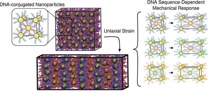 The self-assembly of DNA-conjugated nanoparticles represents a promising avenue toward the design of engineered hierarchical materials. By using DNA to encode nanoscale interactions, macroscale crystals can be formed with mechanical properties that can, at least in principle, be tuned. Here we present in silico evidence that the mechanical response of these assemblies can indeed be controlled, and that subtle modifications of the linking DNA sequences can change the Young’s modulus from 97 kPa to 2.1 MPa. We rely on a detailed molecular model to quantify the energetics of DNA–nanoparticle assembly and demonstrate that the mechanical response is governed by entropic, rather than enthalpic, contributions and that the response of the entire network can be estimated from the elastic properties of an individual nanoparticle. The results here provide a first step toward the mechanical characterization of DNA–nanoparticle assemblies, and suggest the possibility of mechanical metamaterials constructed using DNA.