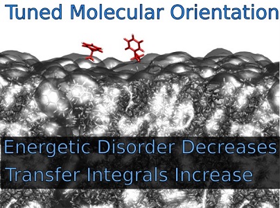 Organic glass films formed by physical vapor deposition exhibit enhanced stability relative to those formed by conventional liquid cooling and aging techniques. Recently, experimental and computational evidence has emerged indicating that the average molecular orientation can be tuned by controlling the substrate temperature at which these “stable glasses” are grown. In this work, we present a comprehensive all-atom simulation study of ethylbenzene, a canonical stable-glass former, using a computational film formation procedure that closely mimics the vapor deposition process. Atomistic studies of experimentally formed vapor-deposited glasses have not been performed before, and this study therefore begins by verifying that the model and method utilized here reproduces key structural features observed experimentally. Having established agreement between several simulated and experimental macroscopic observables, simulations are used to examine the substrate temperature dependence of molecular orientation. The results indicate that ethylbenzene glasses are anisotropic, depending upon substrate temperature, and that this dependence can be understood from the orientation present at the surface of the equilibrium liquid. By treating ethylbenzene as a simple model for molecular semiconducting materials, a quantum-chemical analysis is then used to show that the vapor-deposited glasses exhibit decreased energetic disorder and increased magnitude of the mean-squared transfer integral relative to isotropic, liquid-cooled films, an effect that is attributed to the anisotropic ordering of the molecular film. These results suggest a novel structure–function simulation strategy capable of tuning the electronic properties of organic semiconducting glasses prior to experimental deposition, which could have considerable potential for organic electronic materials design.