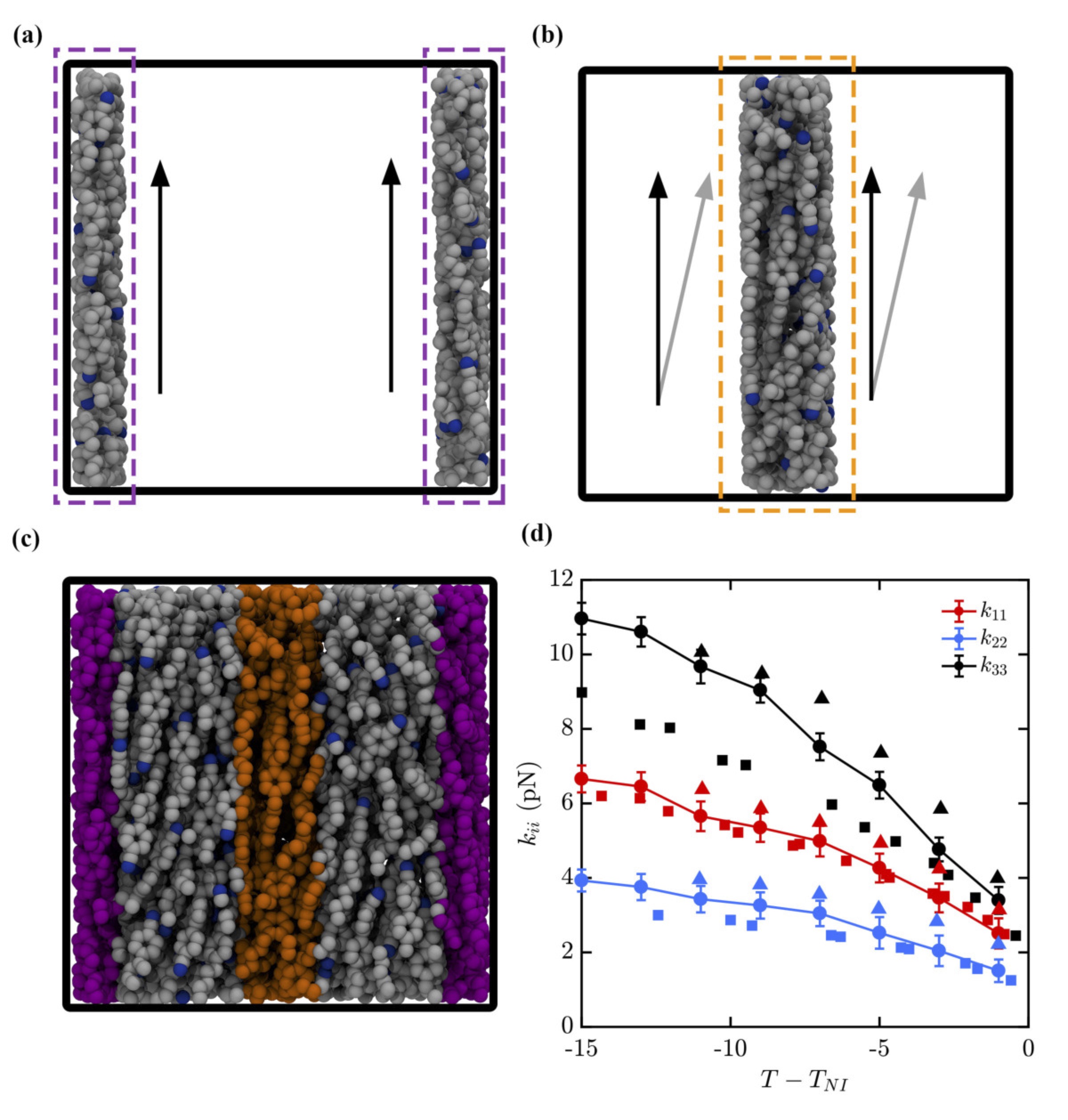 A free energy perturbation method is used to systematically study the elastic properties of four common Gay–Berne nematogenic models; two with a length-to-diameter ratio κ = 3 [(3, 5, 1, 2) and (3, 5, 1, 3)], a model with κ = 4.4 parameterised for p-terphenyl (4.4, 20, 1, 1), and a discogen with κ = 0.345 (0.345, 0.2, 1, 2). In accordance with previous measurements, we find that for κ = 3, models, . We additionally find the latter two models in particular accurately capture the experimentally measured elastic ratios in apolar achiral systems. The (4.4, 20, 1, 1) model reproduces the elastic constant ratios of p-azoxyanisole remarkably well, and maps to within 30% of the absolute. The (0.345, 0.2, 1, 2) model elastic constants exhibit an unusual temperature dependence similar to recent experimental studies. Here we find , in line with theoretical predictions. All models deviate from the mean-field expectation kii ∝ S2. These results represent a crucial first step towards quantitatively accurate coarse-grained liquid crystalline models of self-assembly and response, enabling one to choose a Gay–Berne model based on its measured elastic ratios rather than just its shape and energy anisotropy.