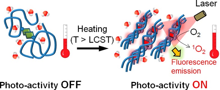 We developed a thermoswitchable polymeric photosensitizer (T-PPS) by conjugating PS (Pheophorbide-a, PPb-a) to a temperature-responsive polymer backbone of biocompatible hydroxypropyl cellulose. Self-quenched PS molecules linked in close proximity by π–π stacking in T-PPS were easily transited to an active monomeric state by the temperature-induced phase transition of polymer backbones. The temperature-responsive intermolecular interaction changes of PS molecules in T-PPS were demonstrated in synchrotron small-angle X-ray scattering and UV–vis spectrophotometer analysis. The T-PPS allowed switchable activation and synergistically enhanced cancer cell killing effect at the hyperthermia temperature (45 °C). Our developed T-PPS has the considerable potential not only as a new class of photomedicine in clinics but also as a biosensor based on temperature responsiveness.