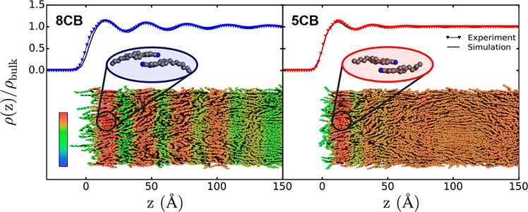 Numerous applications of liquid crystals rely on control of molecular orientation at an interface. However, little is known about the precise molecular structure of such interfaces. In this work, synchrotron X-ray reflectivity measurements, accompanied by large-scale atomistic molecular dynamics simulations, are used for the first time to reconstruct the air-liquid crystal interface of a nematic material, namely, 4-pentyl-4′-cyanobiphenyl (5CB). The results are compared to those for 4-octyl-4′-cyanobiphenyl (8CB) which, in addition to adopting isotropic and nematic states, can also form a smectic phase. Our findings indicate that the air interface imprints a highly ordered structure into the material; such a local structure then propagates well into the bulk of the liquid crystal, particularly for nematic and smectic phases.