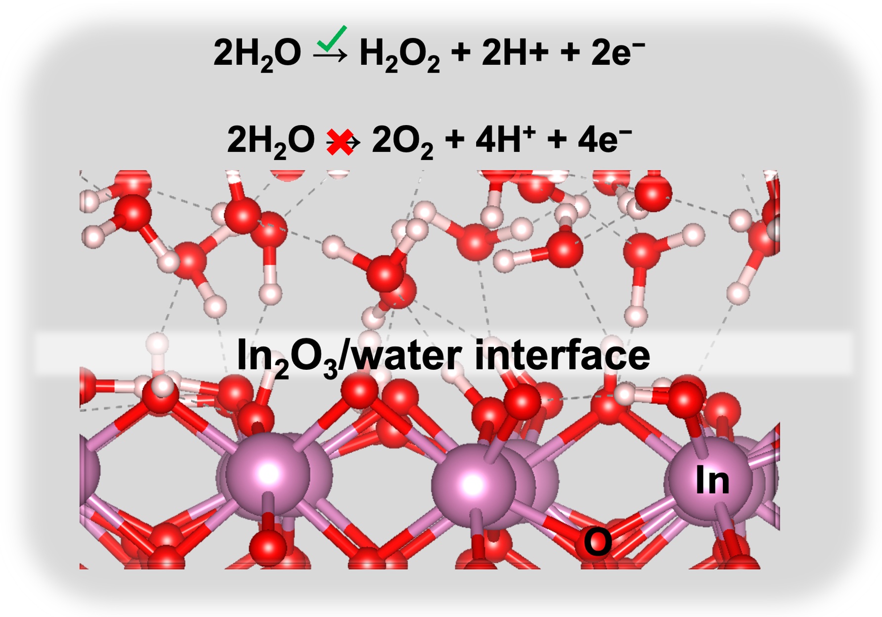 Using a combination of first-principles molecular dynamics simulations and electronic structure calculations, we characterize the atomistic structure and vibrational properties of a photocatalytic surface of In2O3, a promising photoelectrode for the production of hydrogen peroxide. We then investigate the surface in contact with water and show that the electronic states of In2O3 are appropriately positioned in energy to facilitate the two-electron water oxidation reaction (WOR) over the competing four-electron oxygen evolution reaction. We further propose that the use of strained thin films interfaced with water is beneficial in decreasing the optical gap of In2O3 and thus in utilizing a wider portion of the solar spectrum for the WOR.