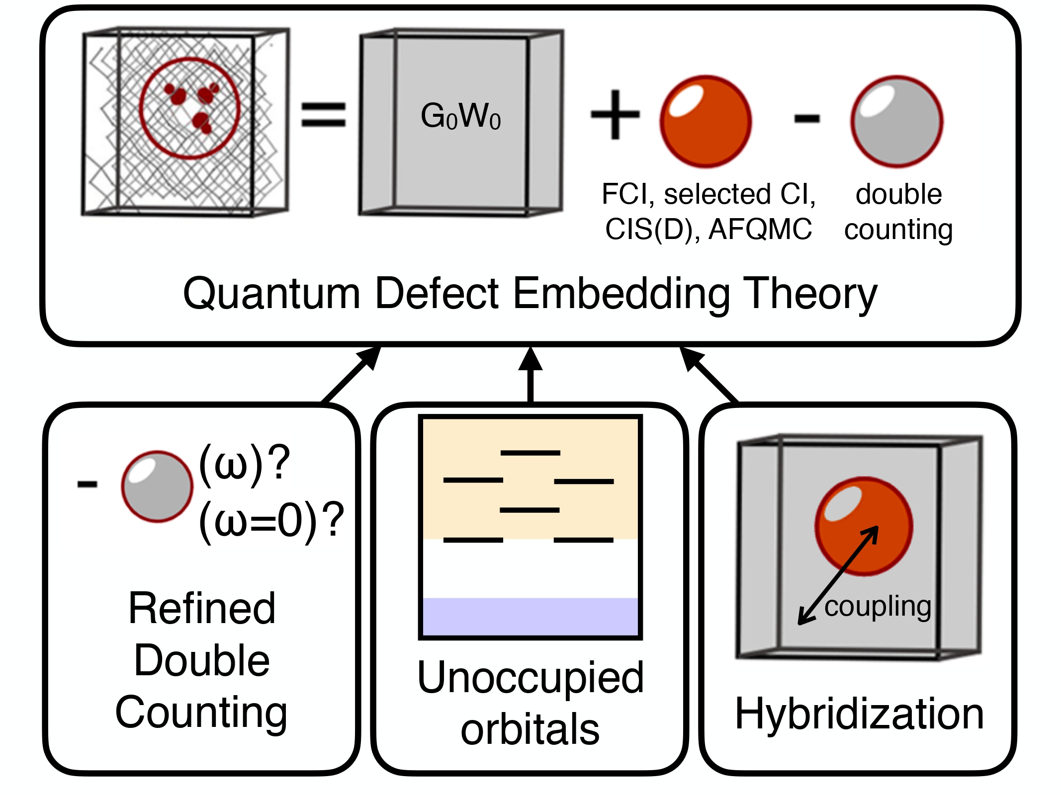 Quantum defect embedding theory (QDET) is a many-body embedding method designed to describe condensed systems with strongly correlated electrons localized within a given region of space, for example spin defects in semiconductors and insulators. Although the QDET approach has been successful in predicting the electronic properties of several point defects, several limitations of the method remain. In this work, we propose multiple advances to the QDET formalism. We derive a double-counting correction that consistently treats the frequency dependence of the screened Coulomb interaction, and we illustrate the effect of including unoccupied orbitals in the active space. In addition, we propose a method to describe hybridization effects between the active space and the environment, and we compare the results of several impurity solvers, providing further insights into improving the reliability and applicability of the method. We present results for defects in diamond and for molecular qubits, including a detailed comparison with experiments.